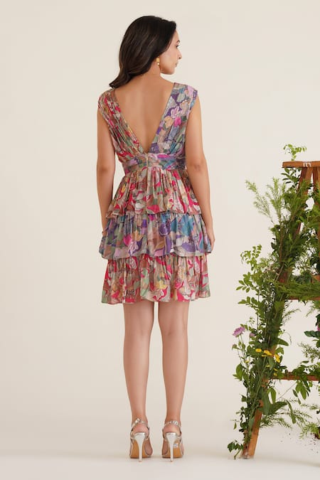 Multi Color Cotton Plunge Neck Xena Floral Print Tiered Dress