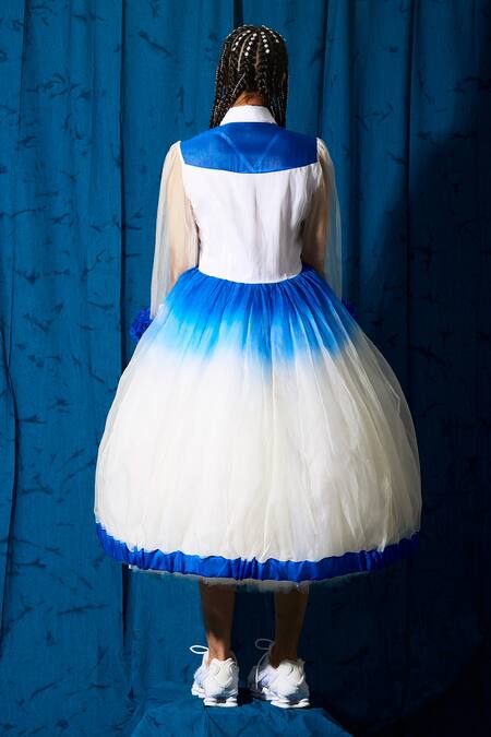 Off-white dress in blue dip-dyed tulle with silk overlay and hand made applique flower bouquets on the sleeves.