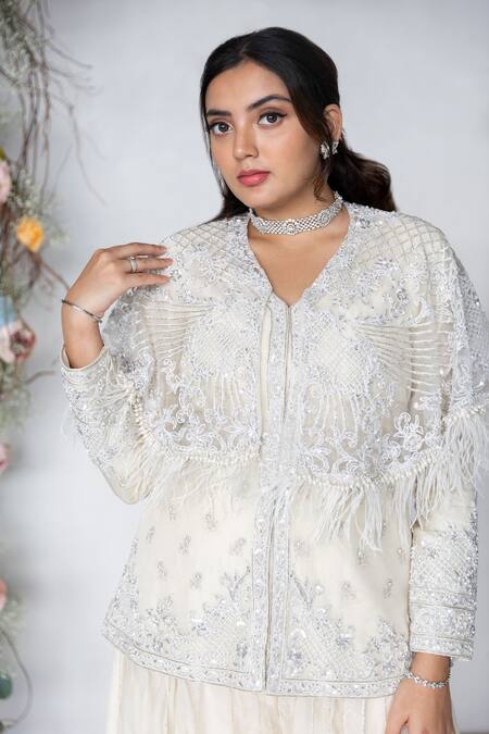 Ivory embroidered kurta featuring a V neck, full sleeves, and intricate bead, cutdana, and sequin work. Paired with a flared sharara and an embroidered belt.