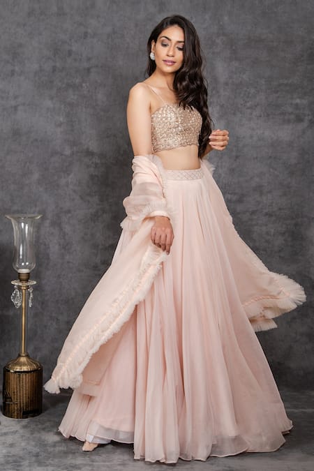 Peach lehenga featuring an embroidered waistband and attached cancan. Paired with a scallop patterned cutdana embroidered padded blouse and a pleated dupatta.