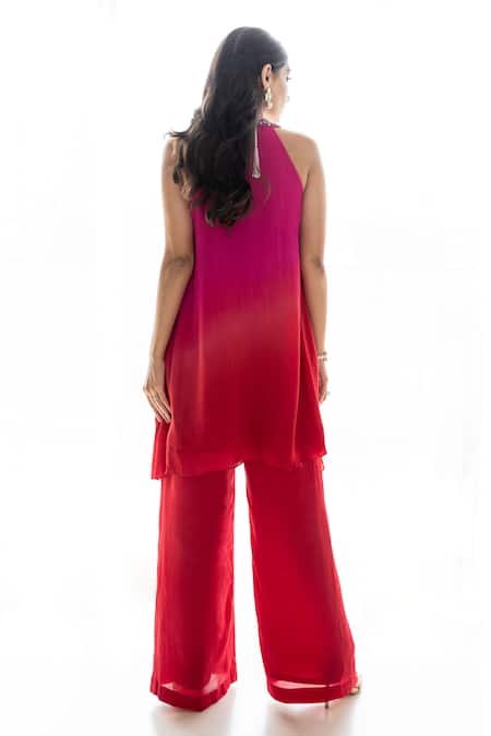 Red & pink ombre tunic featuring pleated cowl draped hem and floral embroidery. Paired with flared pant for a complete look.