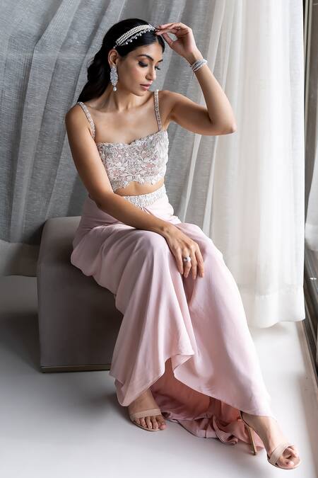Light pink draped skirt featuring pleated cowl drapes. Paired with a sweetheart neck padded blouse adorned with vintage pattern contrast pearl, thread, sequin & cutdana embroidery.