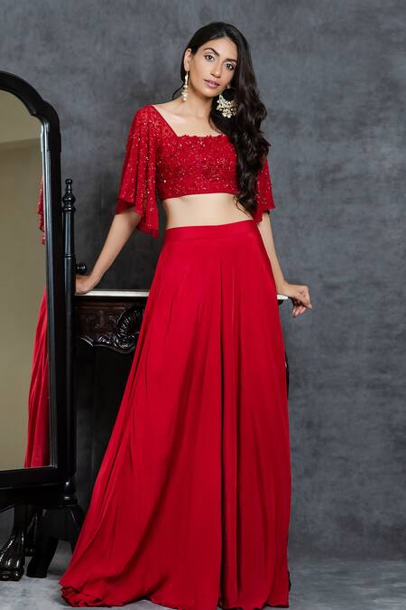 Red sharara set featuring a hand embroidered blouse with bell sleeves and a square neckline. Paired with a layered ruffle dupatta, the outfit showcases cutdana, sequin, and thread work throughout.