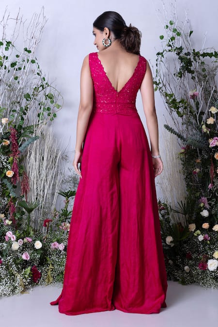 Pink Linen, Satin Sequins, Embroidery V-neck Hand Bodice Jumpsuit