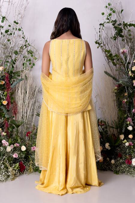 Yellow kurta featuring mirror hand embroidery and a boat neckline. Paired with a matching sharara and dupatta in net fabric.