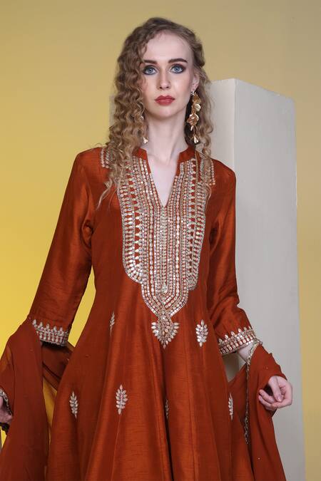 Maroon Silk, Georgette Embroidery Mandarin Collar Aari Bloom Anarkali Set