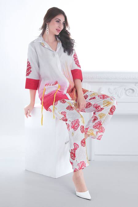 Multi color ombre top featuring three fourth sleeves, spread collar, and stitch line thread embroidery. Paired with foliage print silk pant.