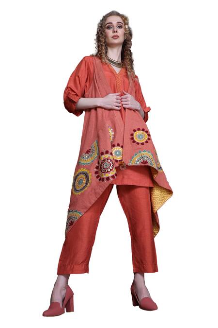 Orange embroidered kurta set featuring a V neck, three-quarter sleeves, and a lined asymmetric jacket. The set includes a matching pant made of dupion silk and jute fabric.