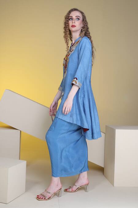 Denim blue kurta featuring three fourth sleeves and mandarin collar with damask bloom embroidery on the yoke. Paired with a solid draped skirt for a fusion style look.