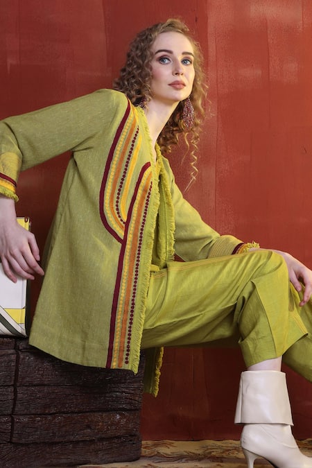 Green jacket featuring three fourth sleeves with dot aari embroidery and raw edges detailing. Paired with a stitch lines embroidered notched neckline top and pant.