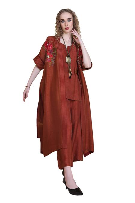 Maroon Silk Embroidery Open Neck Floral Jacket Pant Set