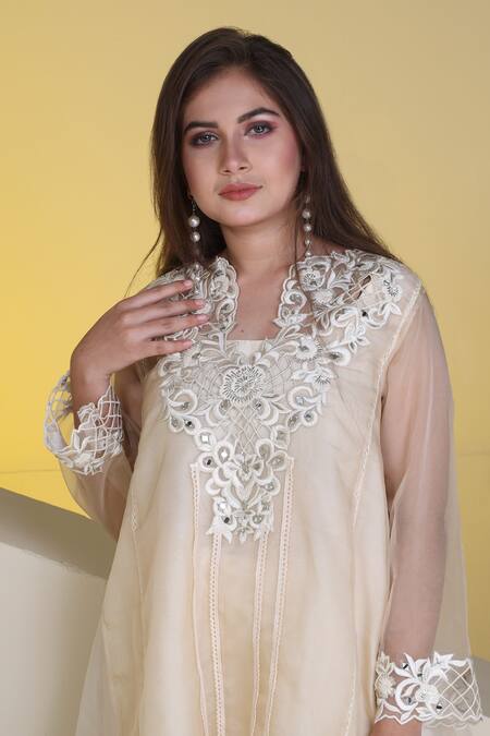 Beige kurta style top featuring floral thread and mirror embroidery. Paired with a lined inner and relaxed fit pant.