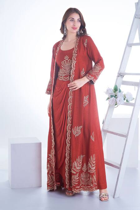 Maroon Silk, Crepe Embroidery Open Neck Gul Jacket With Inner Draped Kurta