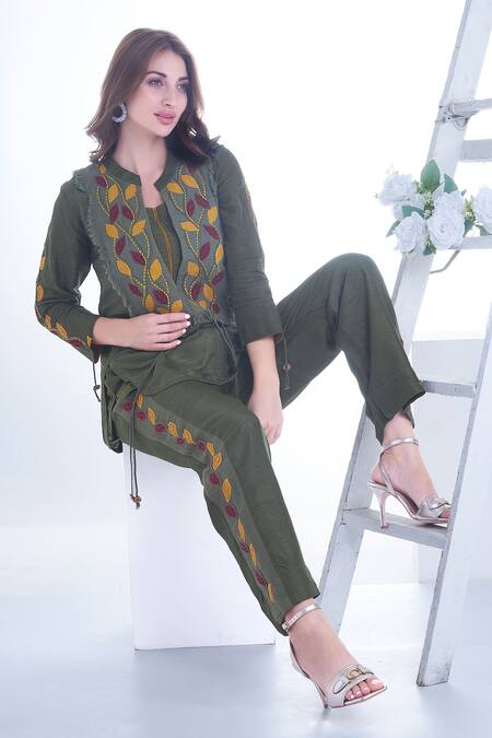 Olive green kurti featuring a Mandarin collar and three fourth sleeves with multi thread leaf embroidery. Paired with an inner and embroidered pant.