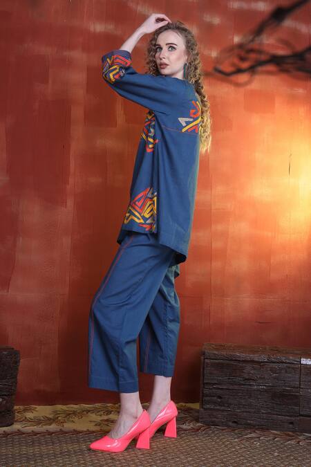 Blue Linen Cotton Embroidery Aari Collar Maze Asymmetric Top With Pant