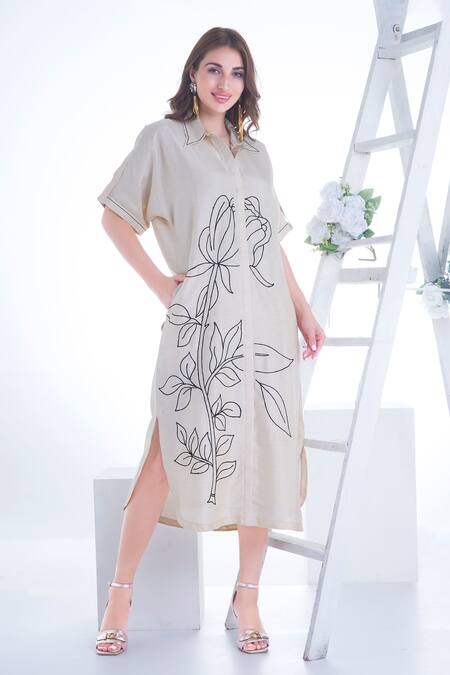 Beige Silk, Linen Embroidery Collared Rose Bloom Dress