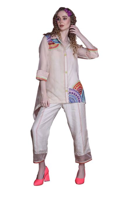 Ivory collared top in organza featuring vibrant thread embroidery. Paired with a matching inner and lined pant.