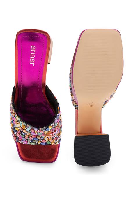 Multi color platform heels featuring abstract rhinestone embellishments on the front strap