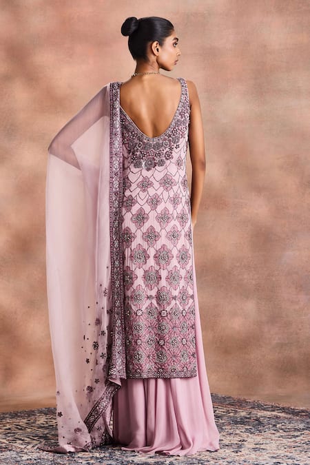 A lilac shimmer georgette long straight kurta featuring intricate geometric and floral motifs with embellishments and a deep scoop neckline. It is paired with fluid lilac sharara pants and a sheer lilac dupatta detailed with delicate embroidery along the borders.