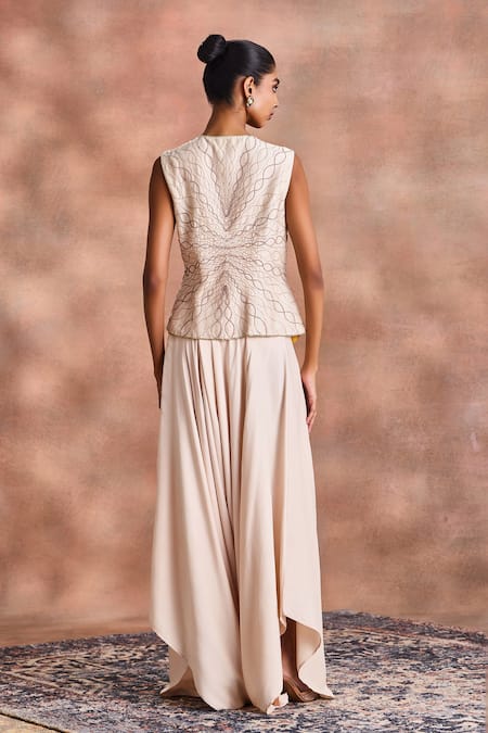 A dew white sleeveless top crafted from Chanderi and dull satin, featuring an asymmetric silhouette with intricate embroidery and textural detailing. Paired with coordinating fluid dhoti-style pants.