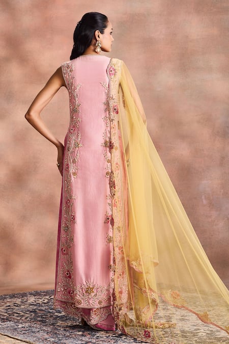 A pearl blush pink straight kurta crafted from silk chanderi, featuring intricate floral embroidery along the neckline, panels, and hem. It is paired with an embroidered pearl blush pink palazzo pant and a sheer misted yellow dupatta.