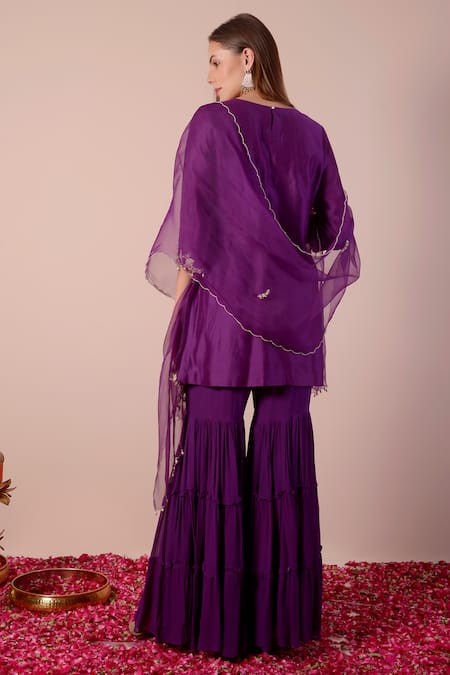 Purple kurta featuring floral embroidery with cutdana, sequin, and bead work. Paired with a tiered gharara and scallop bordered sheer dupatta.