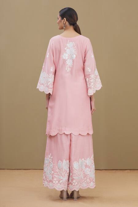 Onion pink kurta with all-over floral applique work, round neckline and scallop edged hem. Comes with palazzo and dupatta.