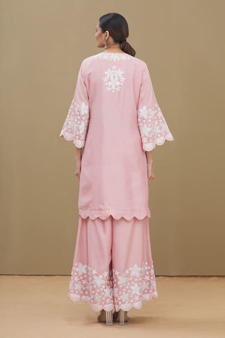 Onion pink kurta with all-over floral applique work, round neckline and scallop edged hem. Comes with palazzo and dupatta.
