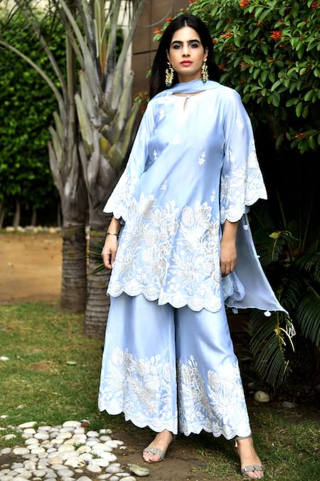 Powder blue short kurta with all-over dori-applique embroidered motifs. Comes with flared pants & chiffon tassel dupatta.