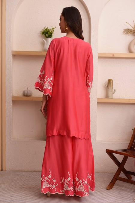 Crimson red chanderi kurta with dori, floral embroidery. Paired with sharara & dupatta.