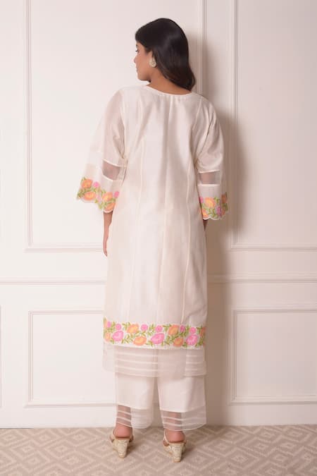 Buy_Surabhi Arya_White Organza, Chanderi Floral Applique Work V Neck Kurta Set_at_Aza_Fashions