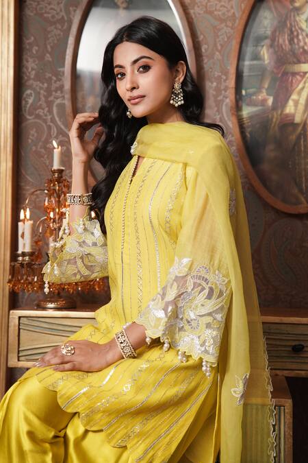 Lemon yellow kurta featuring bell sleeves with organza and zari cutwork details. Paired with a scalloped border dhoti pant and an embroidered dupatta.