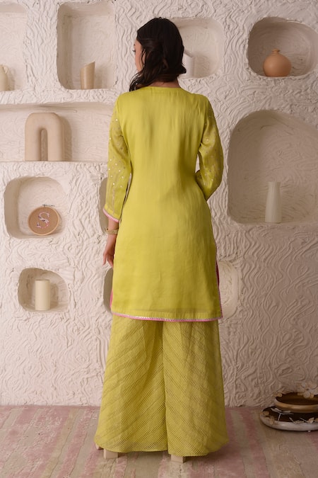 Green floral embroidered kurta in gota work. Paired with cutwork hem sharara and dupatta.