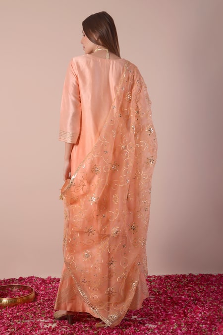 Buy_Surabhi Arya_Peach Bamboo, Organza Embroidery, Gota Patti Round Neck Kurta Sharara Set