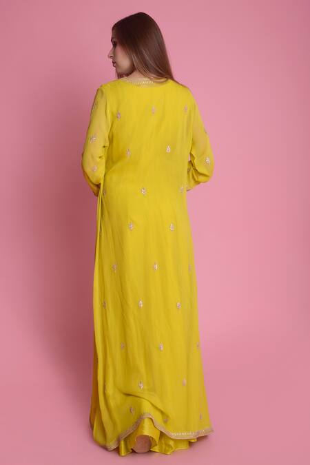 Yellow Chanderi gown with floral hand embroidered motifs. Paired with front-open floral embroidered jacket.