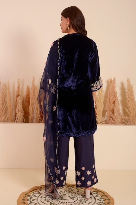 Buy_Surabhi Arya_Blue Velvet Sequins, Embroidery Mandarin Midnight Bloom Kurta With Pant _Online_at_Aza_Fashions