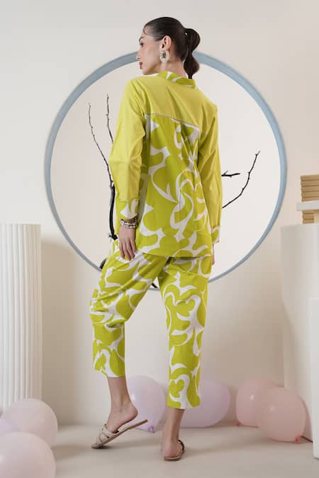 Lime green shirt featuring cutwork embroidery on the front. Paired with coordinating lime green pants with a bold pattern.