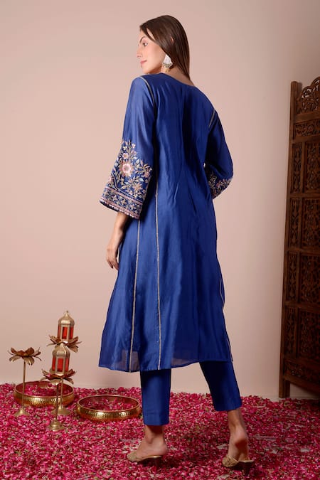 Buy_Surabhi Arya_Blue Silk, Chanderi Sequins, Zari Round Neck Embroidered Kurta And Pant Set _at_Aza_Fashions