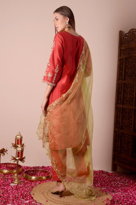 Red Silk, Chanderi, Organza Beads, Zari Round Neck Embroidered Kurta Set