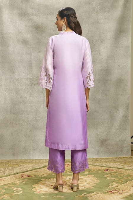 Lilac ombre silk chanderi kurta featuring a V neck, flared sleeves, and hand embroidered floral cutwork with dori detailing. Paired with an elasticated waistband palazzo with attached lining.