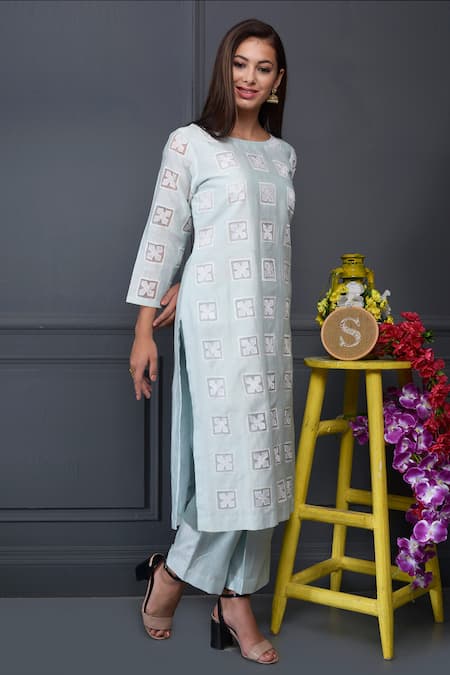 Buy_Surabhi Arya_Blue Silk Chanderi Kurta And Pant Set_at_Aza_Fashions