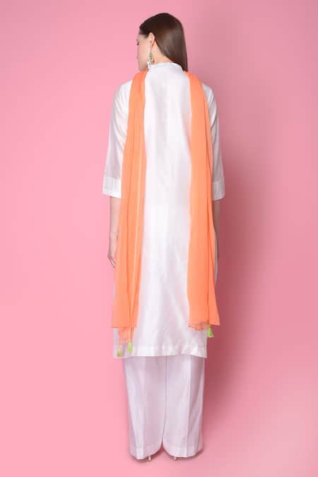 White straight long kurta with placement floral motif patchwork & tassel placket. Comes with pants & contrast chiffon dupatta.