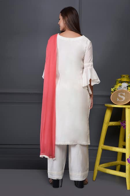 White straight long kurta with all-over floral motif applique-thread work & bell sleeves. Comes with pants & contrast crushed taby silk dupatta.
