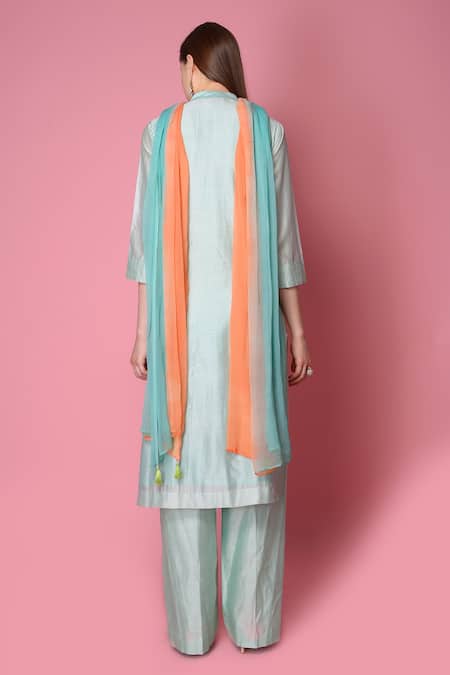 Blue Kurta And Pant Silk Chanderi Dupatta Chiffon Set