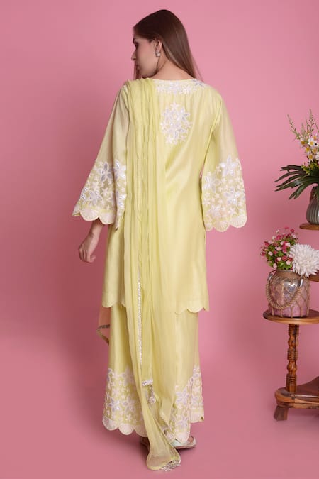 Lime yellow straight kurta with all-over floral motif applique-dori work & scallop hem. Comes with sharara pants & tassel dupatta.