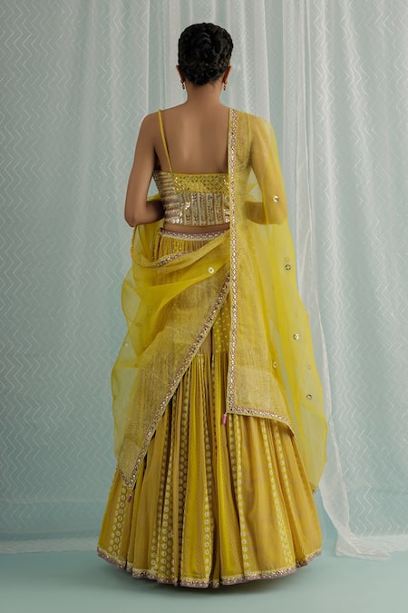 Canary yellow lehenga featuring a tiered design with chevron hand block print and gota, bead, and sequin embroidery. Paired with a padded blouse and a sheer embroidered organza dupatta.