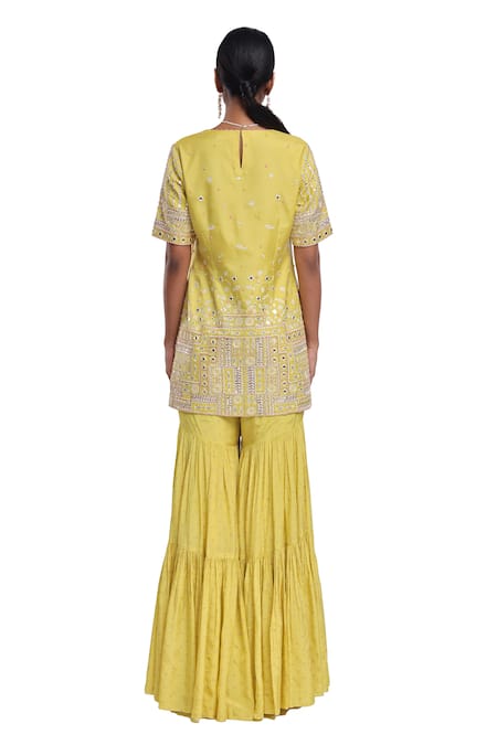 Lime green relaxed fit kurta featuring light to dense resham, pearl, and mirror embroidery. Paired with a block printed tiered sharara and an embroidered silk organza dupatta, finished with pearl and tassel detail.