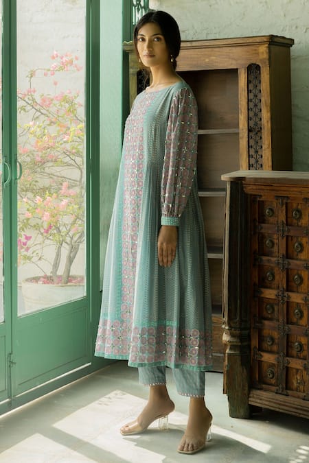 Powder blue side-pleated anarkali with floral & geometric printed motifs, cutdana, sequin & bead work. Paired with stripe printed pant.