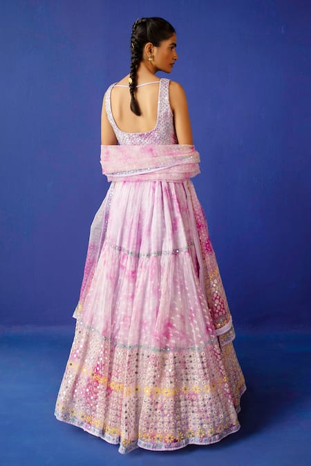 Lilac, fuschia tie & dye lehenga with floral print & embellished sequin, mirror work. Paired with blouse & dupatta.