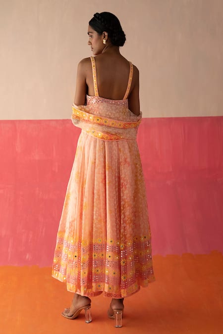 Pink, orange tie &dye anarkali with geometric print & embellished sequin, mirror work. Paired with pant & dupatta.